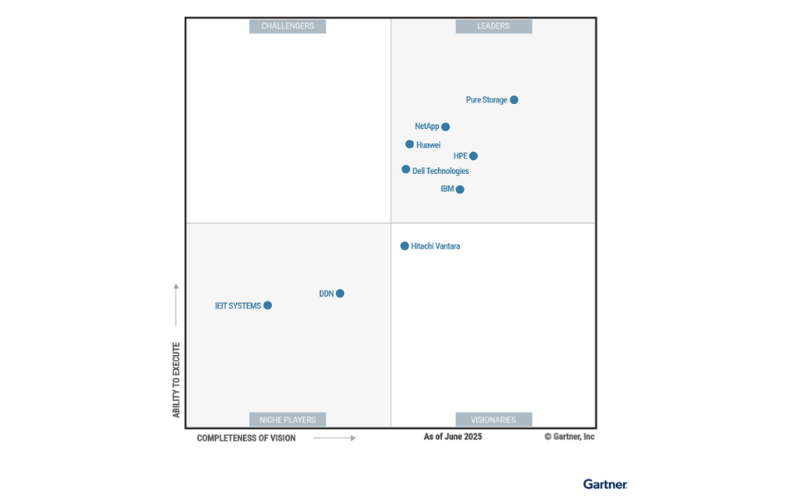 Huawei continues to hold a Leader position in the 2025 Magic Quadrant, thanks to its OceanStor Dorado V7, Pacific, and FlashEver STaaS product lines.