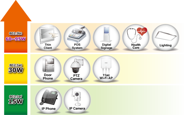 The 802.bt Power over Ethernet++ standard provides 95W of power. The 802.3at Power over Ethernet+ provides 36W of power, and a mid-span 802.3at with Power over Ethernet also provides 36W of power per port.